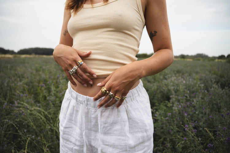 En mmurra, el proceso creativo es tan importante como la pieza final. Cada colección cápsula es irrepetible, como una obra de arte única, elaborada artesanalmente con materiales de alta calidad. Gemma trabaja en cada joya con dedicación y cuidado, buscando siempre la autenticidad en cada diseño. No hay reglas en su taller, solo el compromiso con la sostenibilidad y el deseo de ofrecer algo más que una pieza de joyería: una expresión artística.