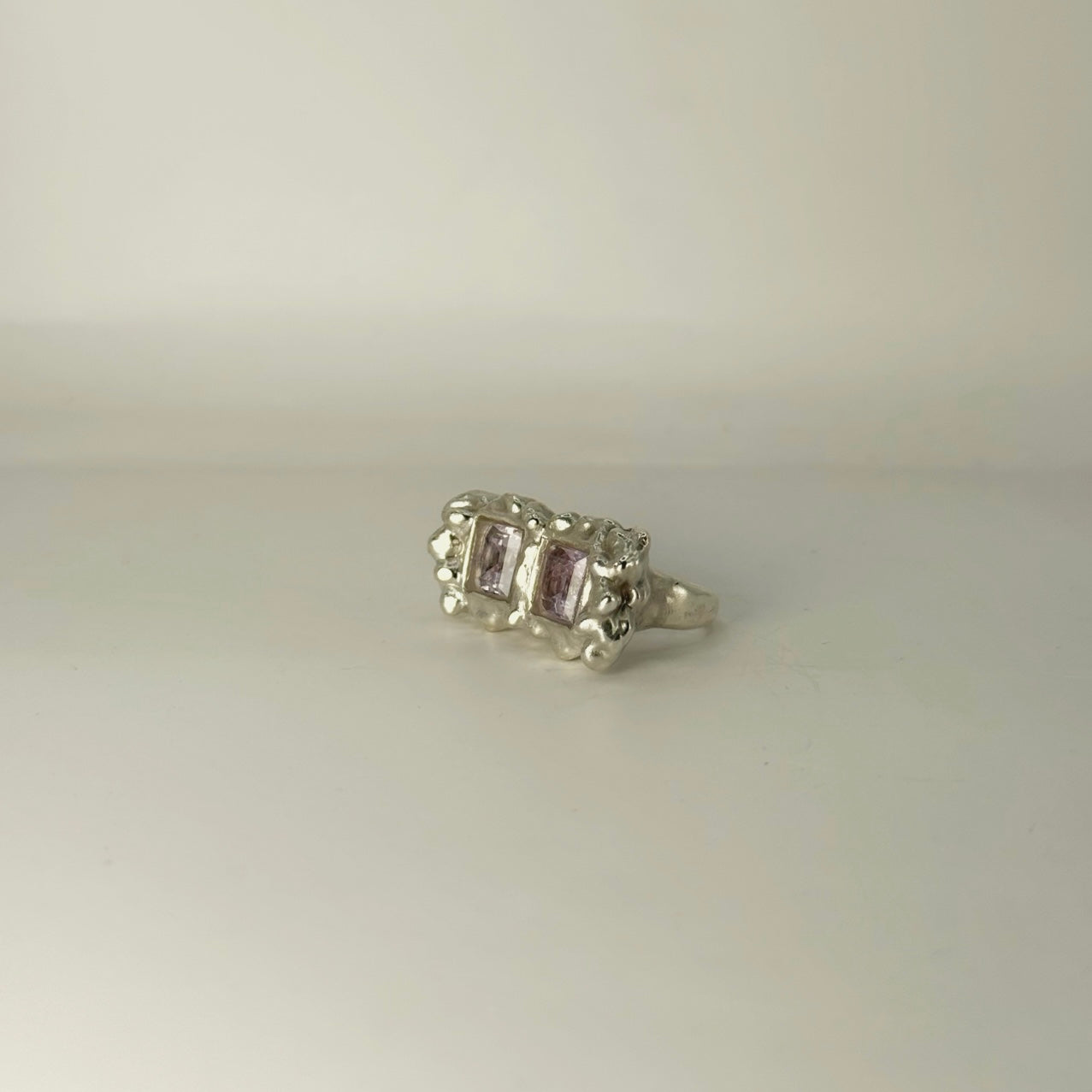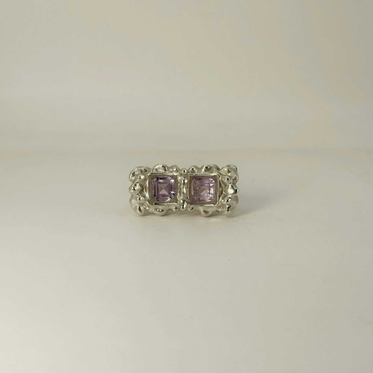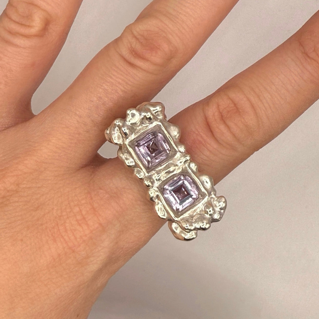 Anillo tipo sello, irregular con dos circonitas cuadradas de amatista. Plata 925 acabado rústico ❤️