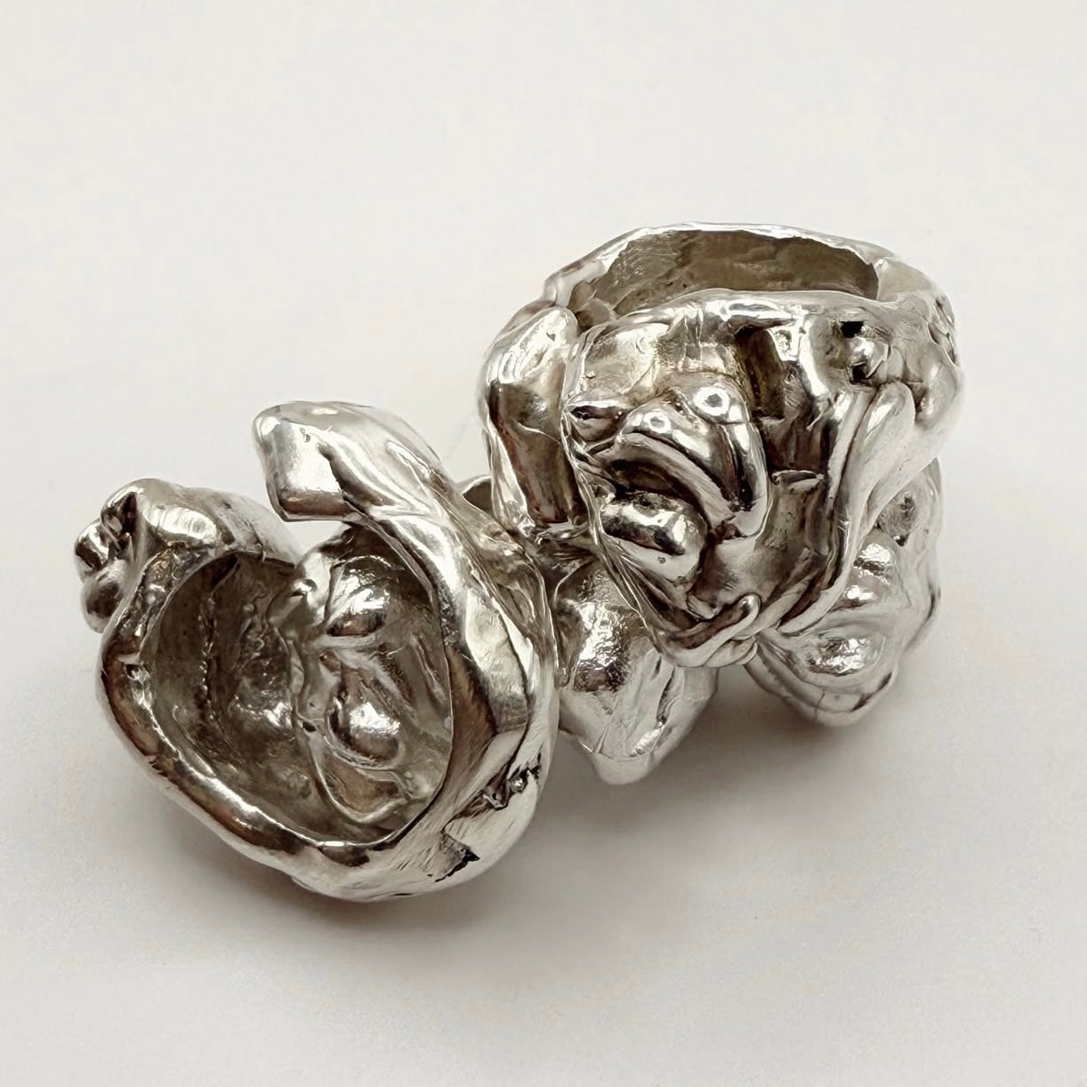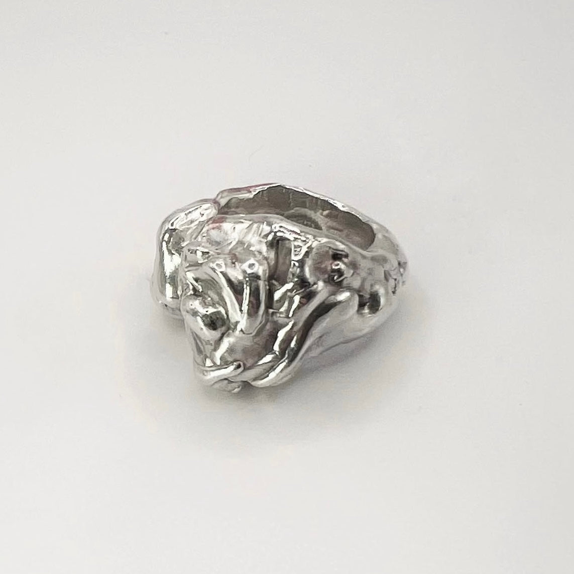 Anillo irregular abierto de plata 925, talla ligeramente ajustable. Acabado rústico.