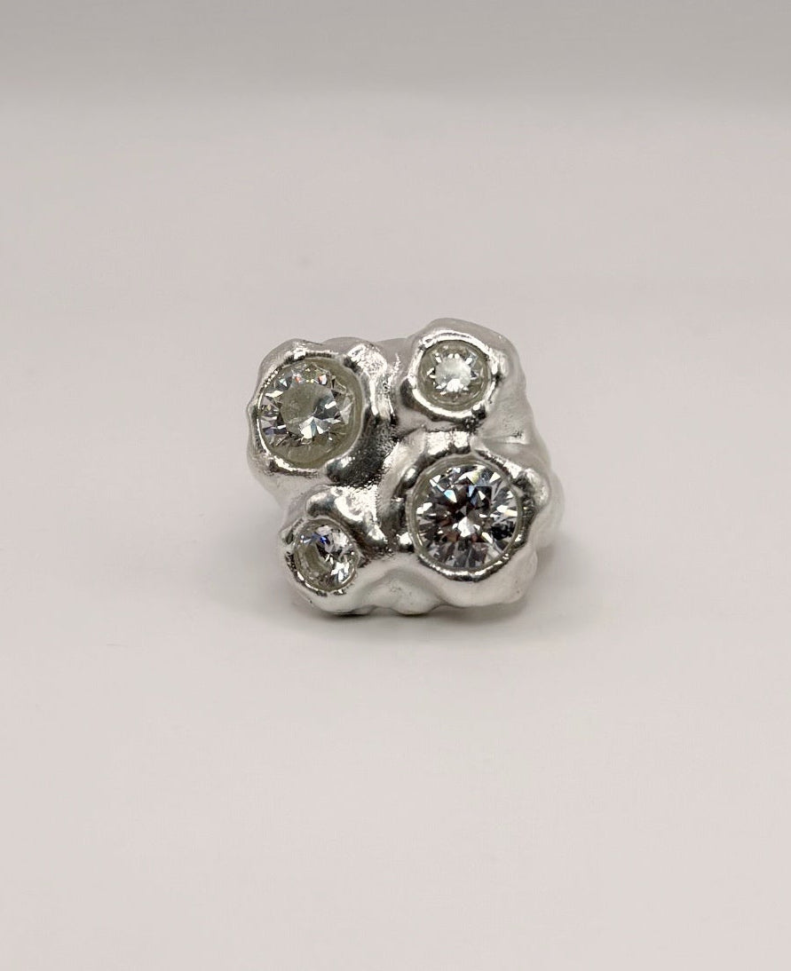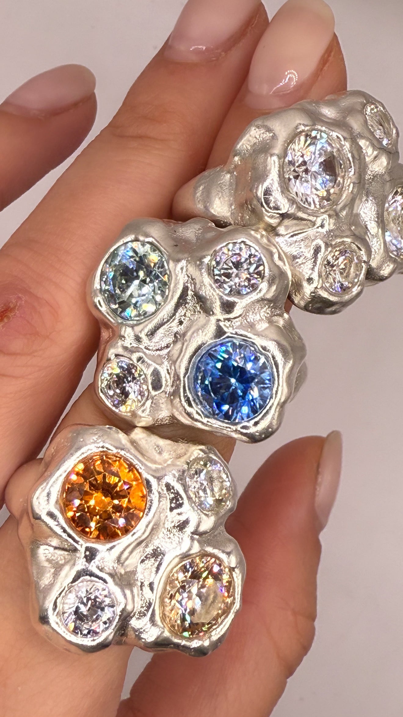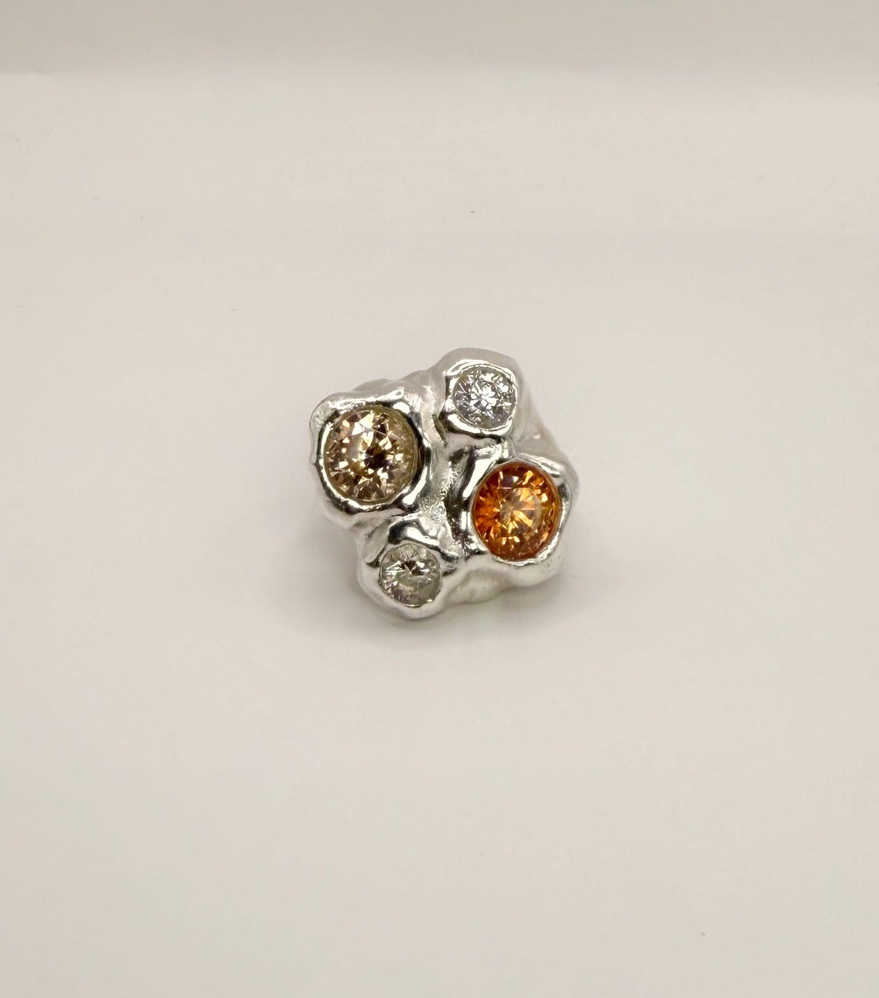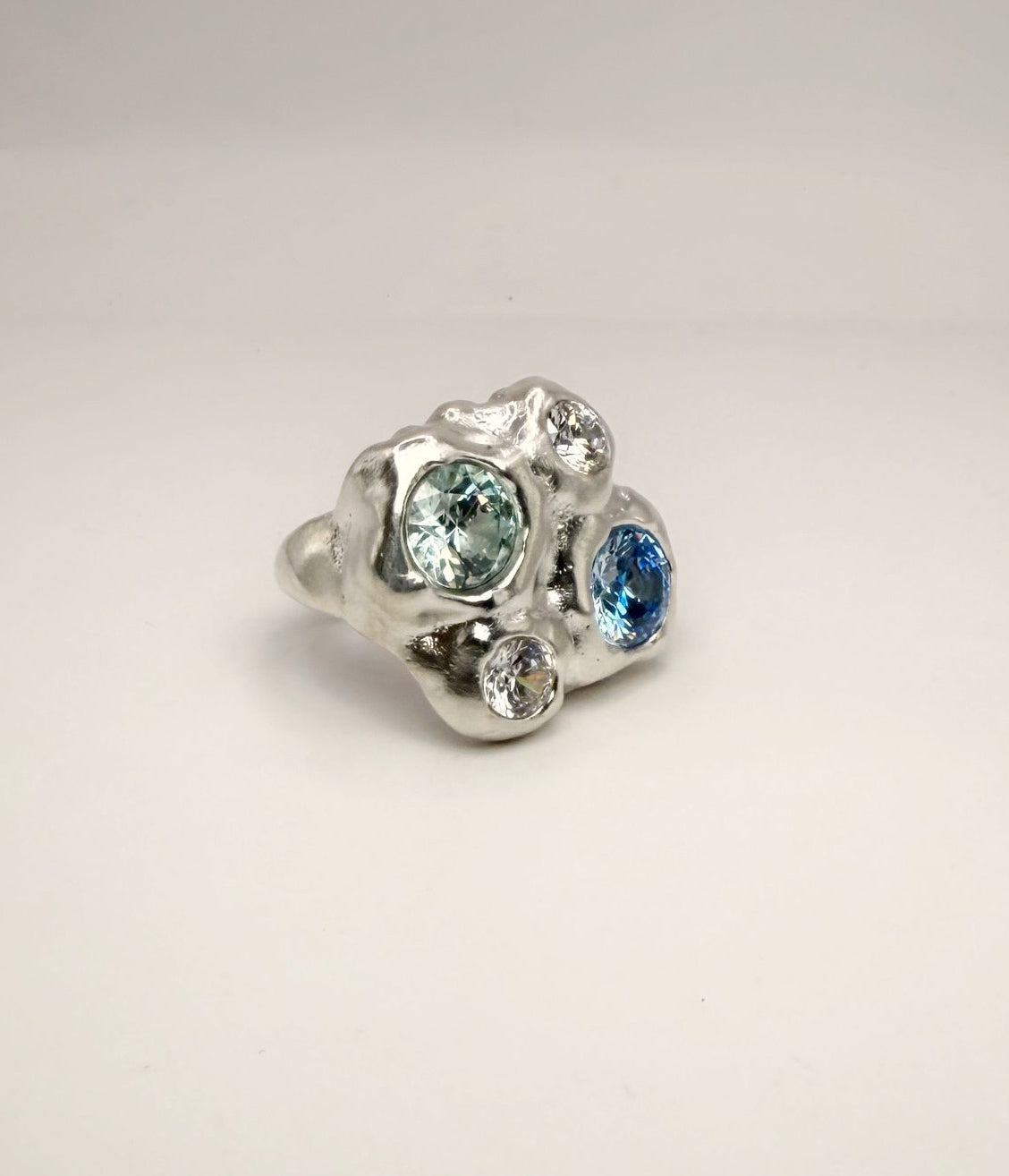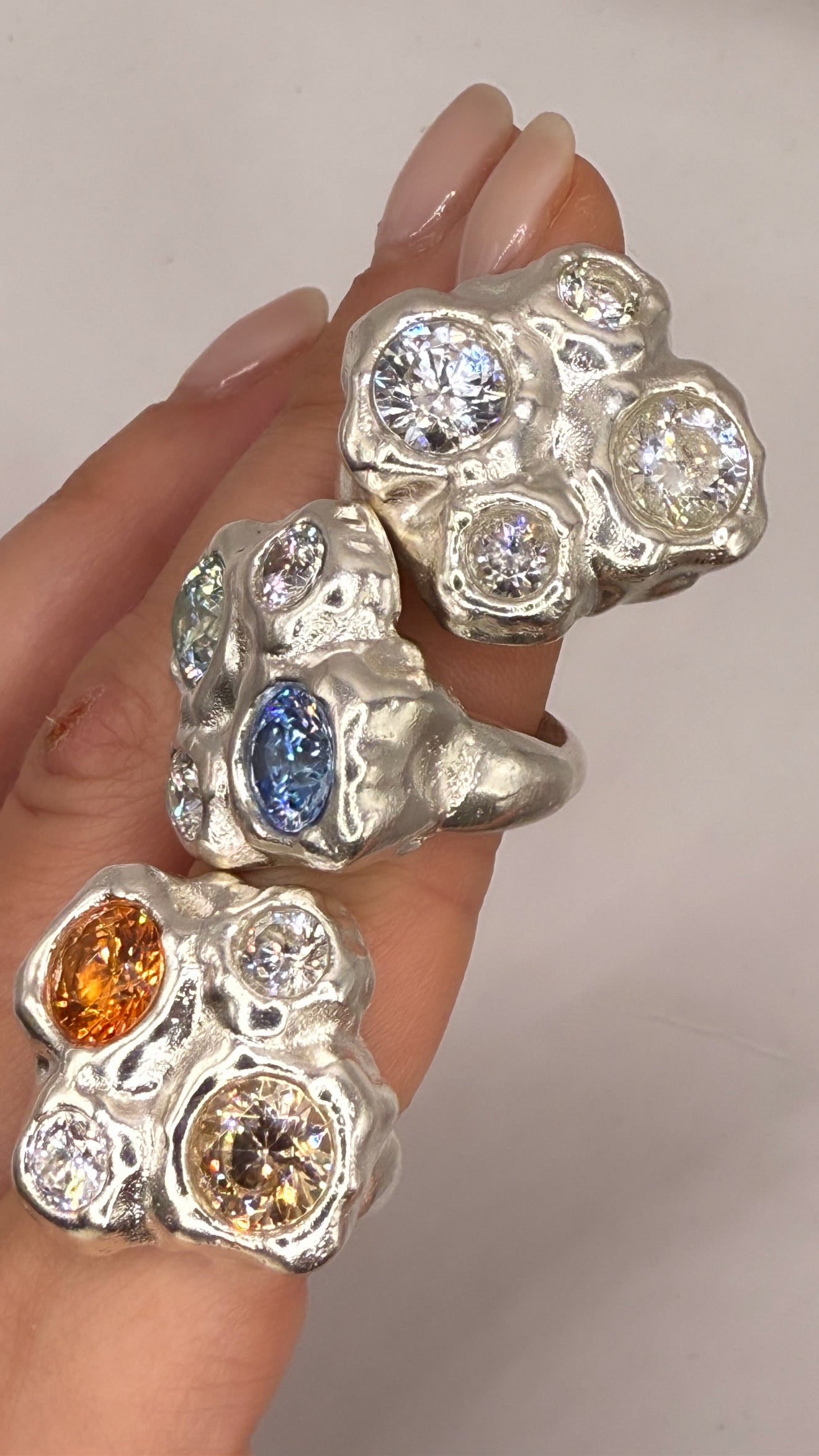 Anillo de gran tamaño plata 925 con 4 circonitas, 3 colores disponibles, inspirado en la flor que lleva su nombre.